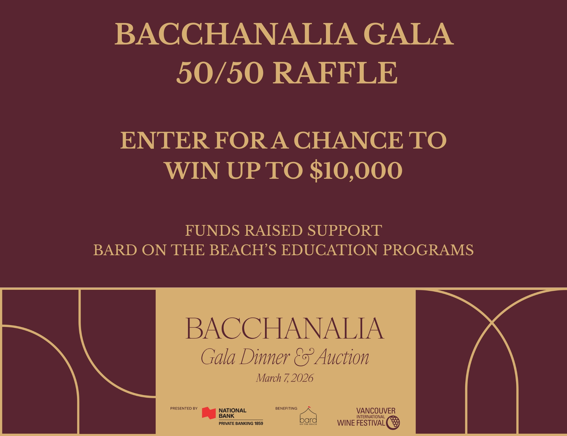 Tickets for the 2026 Vancouver International Wine Festival Bacchanalia Gala Raffle are on sale now! Enter our 50/50 Raffle for your chance to win up to $10,000. Chances to win the Grand Prize are 1 in 200 (total tickets for sale).